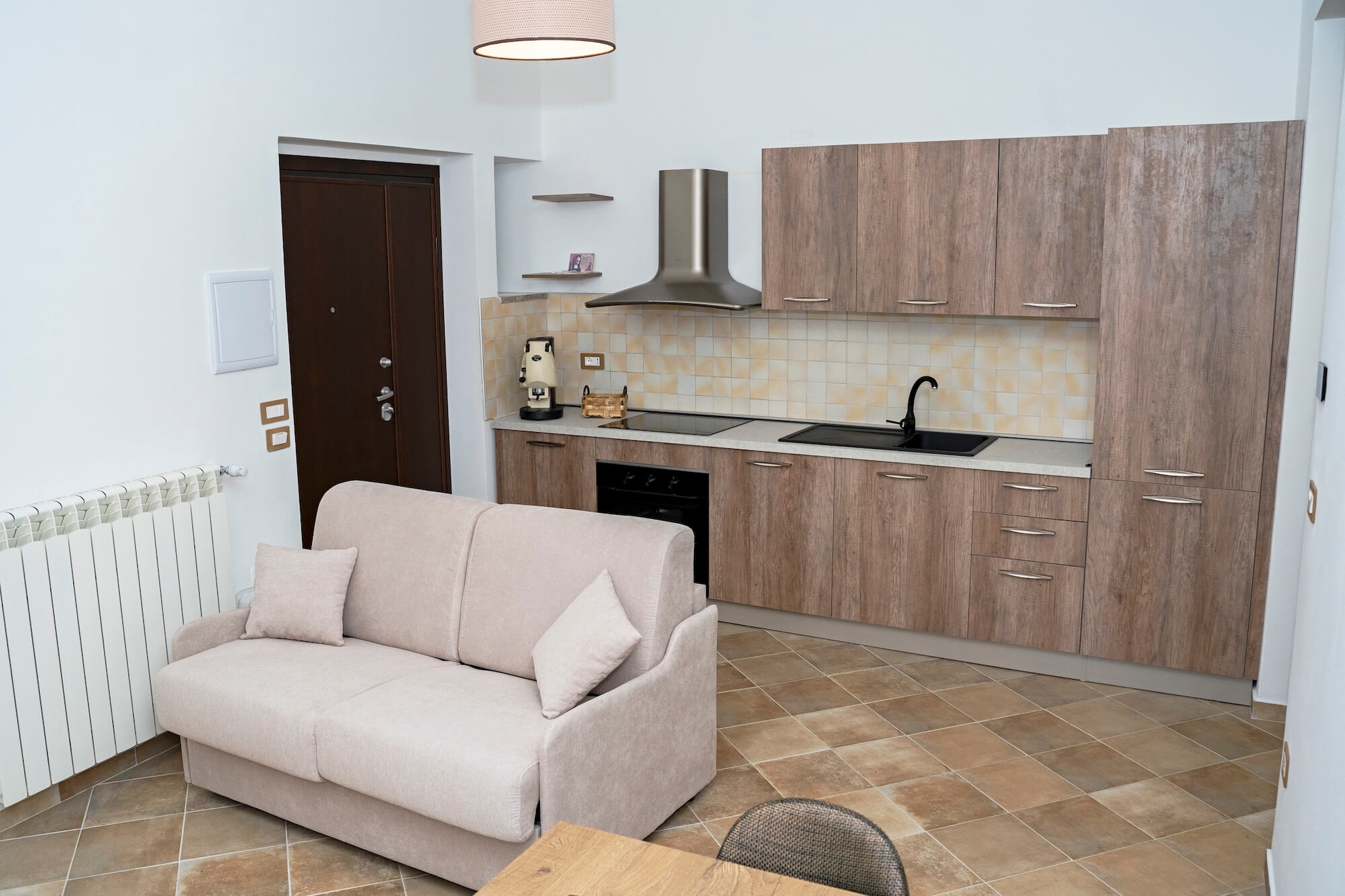 Il soggiorno diventa uno spazio di condivisione: un libro, una chiacchierata, un calice di vino lucano. Il divano letto consente di trasformare l’ambiente in una soluzione comoda anche per famiglie o piccoli gruppi.